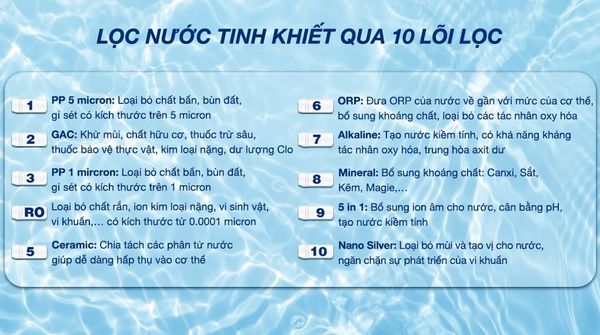 - Lõi Nano Silver (Sx Việt Nam): Loại bỏ mùi và tạo vị cho nước, ngăn chặn sự phát triển của vi khuẩn.